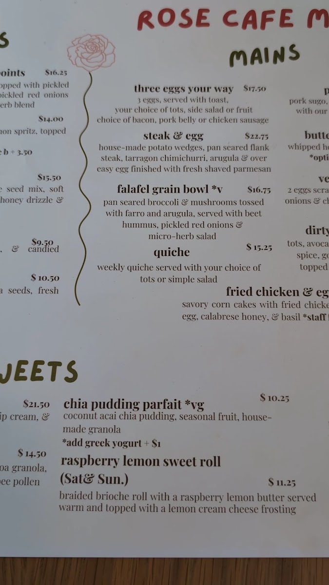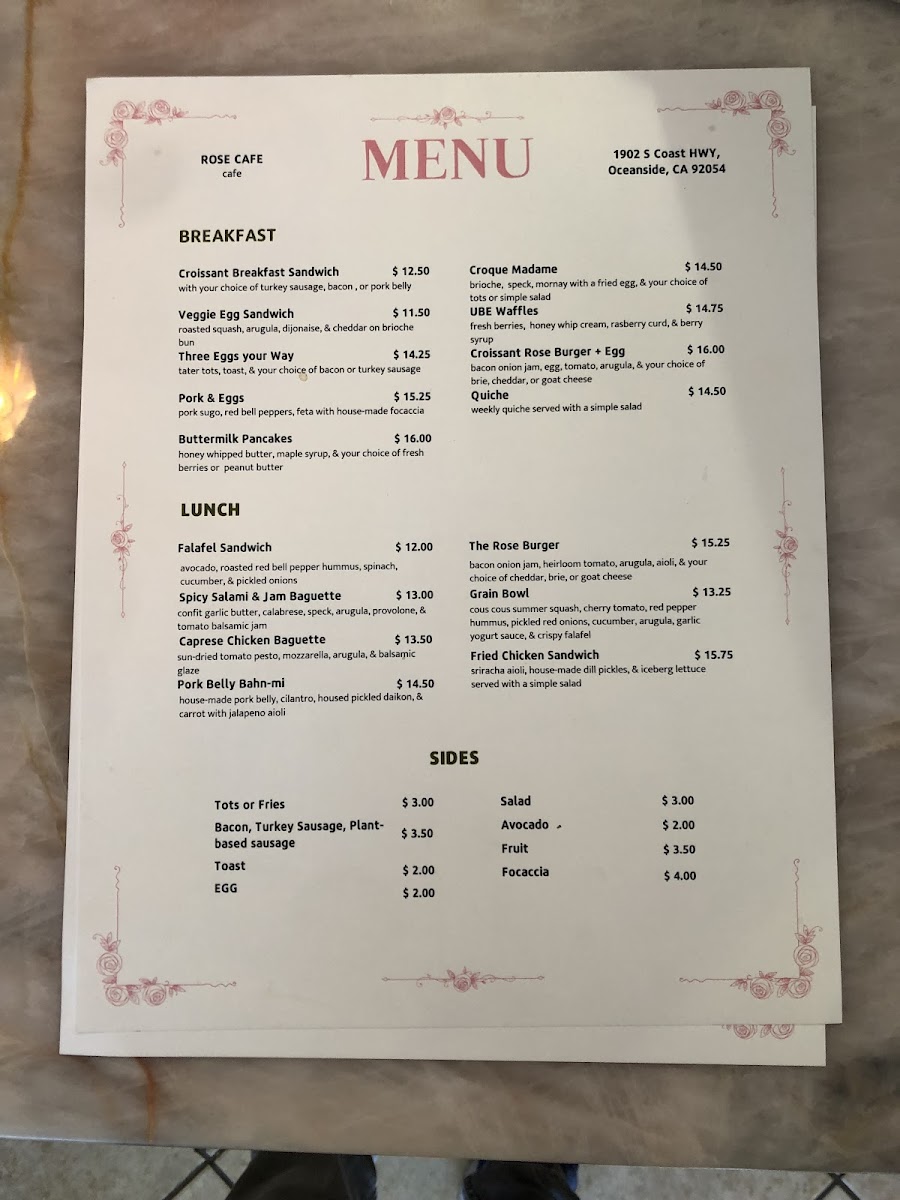 Welcome to Rose Cafe, a charming culinary haven nestled at 1902 S Coast Hwy in Oceanside, CA. This delightful cafe captures the essence of cozy, intimate dining while offering a menu brimming with mouthwatering options. Guests rave about the dirty breakfast tots, a gratifying blend of avocado, fried egg, and savory pork belly, along with heavenly fried chicken paired with corn pancakes. The pastries and perfectly poured lattes elevate your experience, making each visit a special occasion.